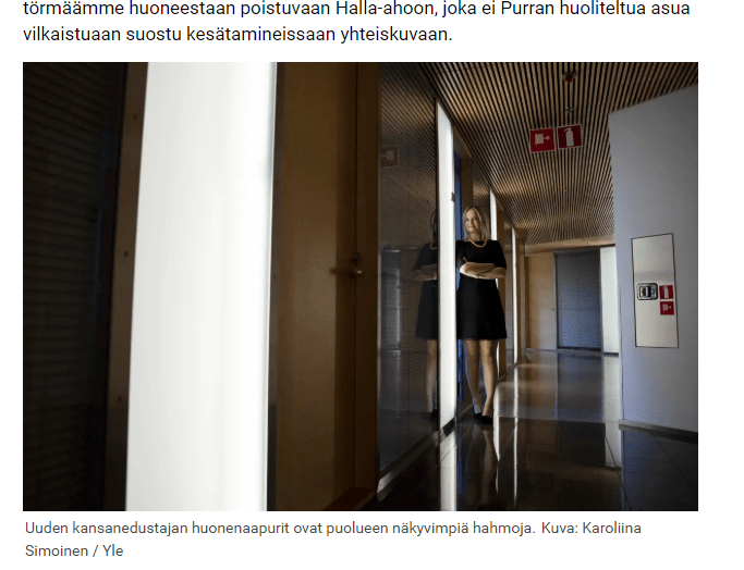 Toimittaja ei haastattelutilanteessa kyennyt pidättelemään intoaan, kun hän tajusi, että itse Halla-aho on myös muuten niin tyhjässä Pikkuparlamentissa. Tietysti meidät yritettiin saada samaan kuvaan (osasimme aavistaa tämän etukäteen). Sitten tarina olisi ollut kuvia myöten täydellinen.