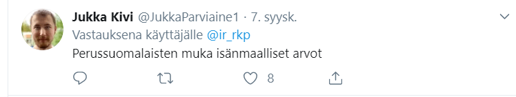 En haaveile Impivaarasta tai edes 80-luvun maksalaatikkomaailmasta, vaan Suomesta, joka on sopivasti ylpeä historiastaan, hyvinvoinnistaan ja arvoistaan. Suomalaisen politiikan tehtävä on pitää huolta Suomesta ja suomalaisista. Tämä on minulle niin päivänselvää, että sen sanominenkin tuntuu typerältä.