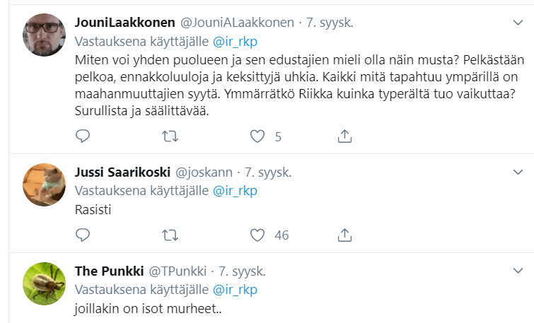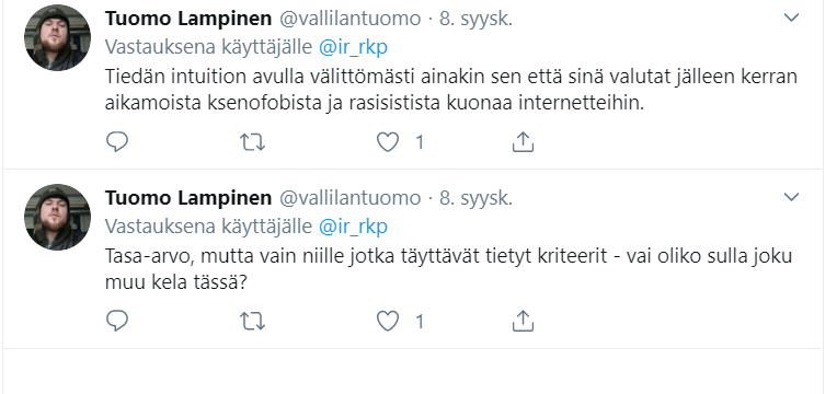Kun kirjoitan sosiaalisessa mediassa maahanmuuton aiheuttamista ongelmista ja eri maiden (yleensä Suomen ja Ruotsin) väestöpohjan muutoksista virallisiin tilastoihin pohjautuen, löytävät paikalle kymmenet, sadat loukkaantuneet ja kiukustuneet. Yksi epäilee, että vien hänen ihmisoikeutensa, kun hänen isänsä on saksalainen. Toinen kysyy, eikö hänen lapsillaan ole oikeutta olla Suomessa, koska appivanhemmat ovat italialaisia. Kolmas kertoo, että vastustan suomalaisia Ruotsissa ja englantilaisia Suomessa, ja että olen natsi, fasisti ja rasisti. Neljäs kertoo, että vaikka hän on Somaliasta, on hän enemmän suomalainen kuin minä. Joku vaatii minulle geenitestiä, toinen kuulaa kalloon, kolmas sanoo kantelevansa jonnekin, neljäs haluaa poistaa kansalaisuuteni.