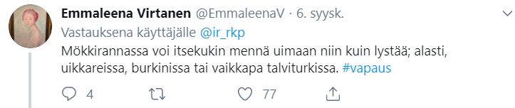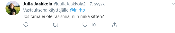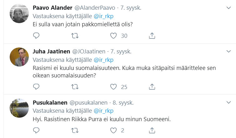 En ota osaa somen suomalaisuuskeskusteluihin. Ne eivät kiinnosta minua eikä minulla ole niihin aikaa. Suomalaisuus – filosofisesti, biologisesti, kulttuurihistoriallisesti ym. – on tietysti kiinnostava asia, mutta käytännön poliittisessa työssäni näille ajatuksille ei ole tilaa eikä käyttöä. En peukuta sen paremmin niitä, joiden mukaan afrikkalaisesta tulee suomalainen, kun hän saa kansalaisuuden, kuin niitäkään, jotka haluavat tarkastella geenejä ja ihmisten sukuhistoriaa kyetäkseen määrittämään suomalaisen.