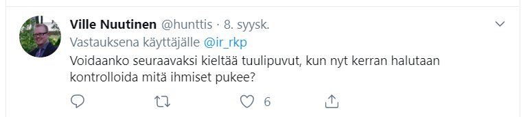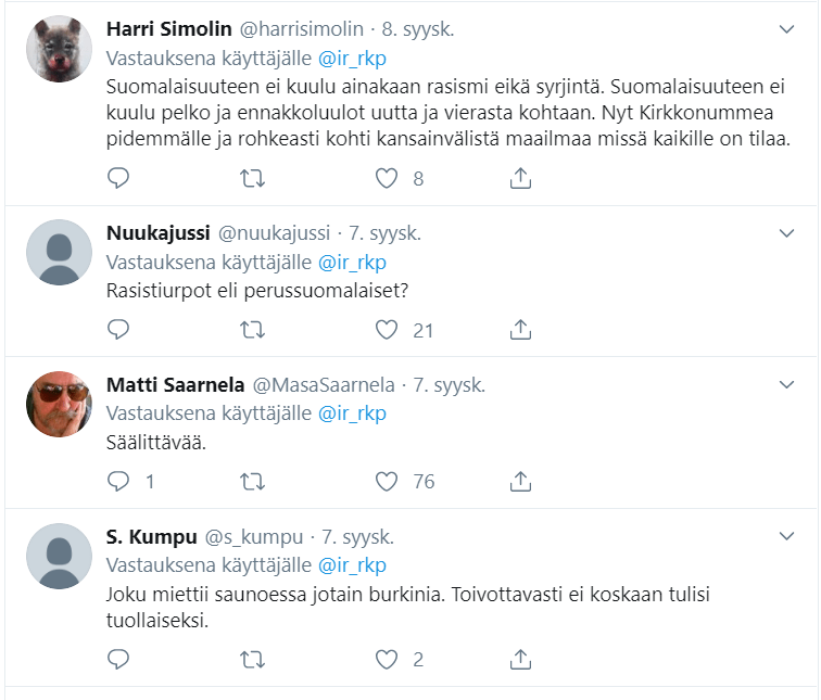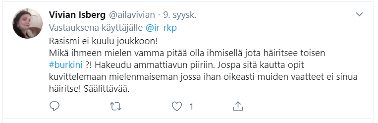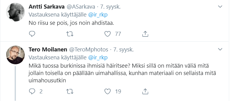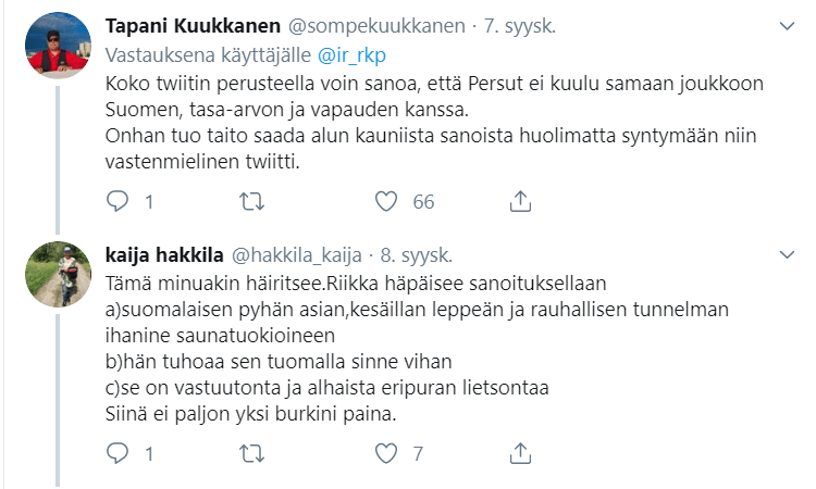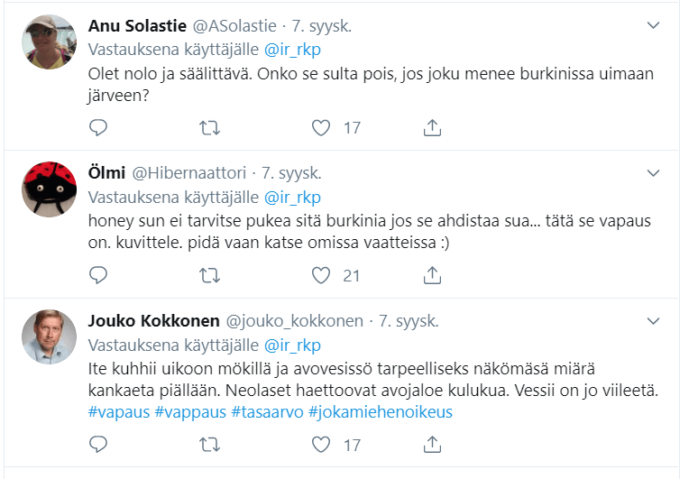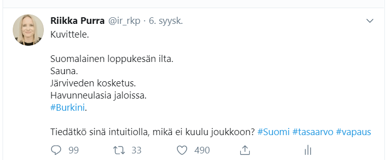 Tällä kertaa Twitterissä kimppuuni hyökkäsi tavallista suurempi joukko ihmisiä – vihaisina, huvittuneina, uhkaillen, ymmärtämättöminä, raivoissaan. He kaikki puolustivat burkinia. Heidän mielestään se sopii Suomeen. Heidän mielestään se on vain pala kangasta, eikä Purralla pitäisi olla mitään sanomista siihen, miten ihmiset pukeutuvat.