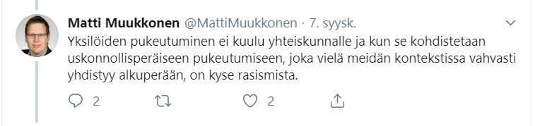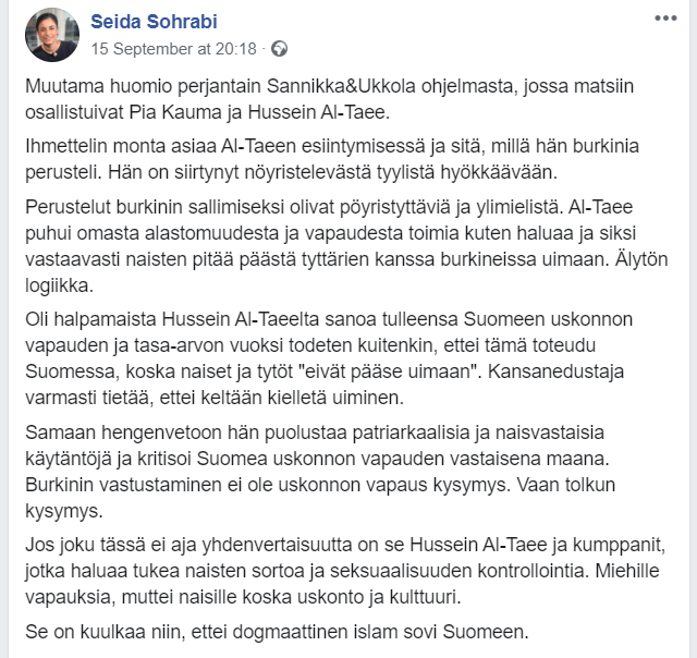 Mielestäni me emme voi Suomessa ottaa tällaista ”pienemmän pahan” moraalista näkökulmaa. Perustavanlaatuiset arvomme joko ovat tai eivät ole – ja tällä hetkellä ne selvästi eivät ole, koska emme vaadi kaikkia täällä asuvia ihmisiä noudattamaan samoja asioita. Kuten Seida Sohrabi on todennut, yhdenvertaisuusvaltuutetun burkinikannanotto viestii, ettei tasa-arvo kuulu Suomessa kaikille, vaan että muslimimiehet ovat jopa täällä naisten yläpuolella.