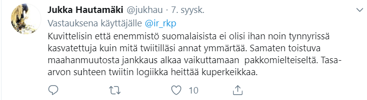 Kun hänelle kertoo maahanmuuttajien yliedustuksesta rikostilastoissa, hän vastaa, kuinka paljon suomalainen – tai perussuomalainen – tekee rikoksia. Vaihtoehtoisesti hän kertoo tuttavistaan, jotka ovat rehellisiä ja kunnollisia.