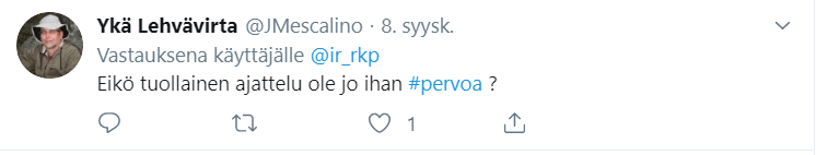 Ja jos somenarsisteille siis kertoo, kuinka paljon vieraskielisten (so. maahanmuuttajien ja maahanmuuttajataustaisten) määrä lisääntyy koko ajan, he kysyvät, vastustanko englantilaisia, saksalaisia tai japanilaisia. Entä ihmisoikeuksia? Ja että enkö salli, että suomalainen tekee lapsia kiinalaisen kanssa.
