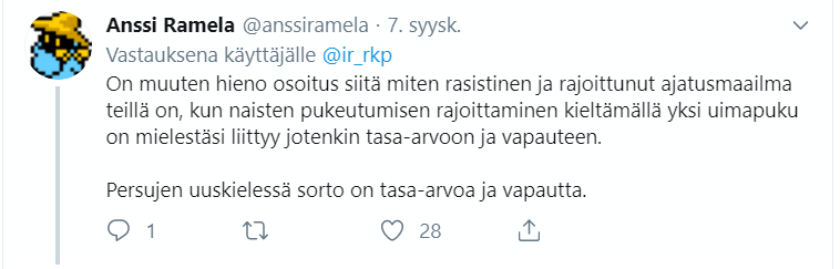 Mutta meidän hyville ihmisillemme kyse on vain kankaasta, eikä kenelläkään, perussuomalaisella varsinkaan, ole oikeutta edes keskustella asiasta. Oksettavaa. Siinä teidän arvopohjanne.