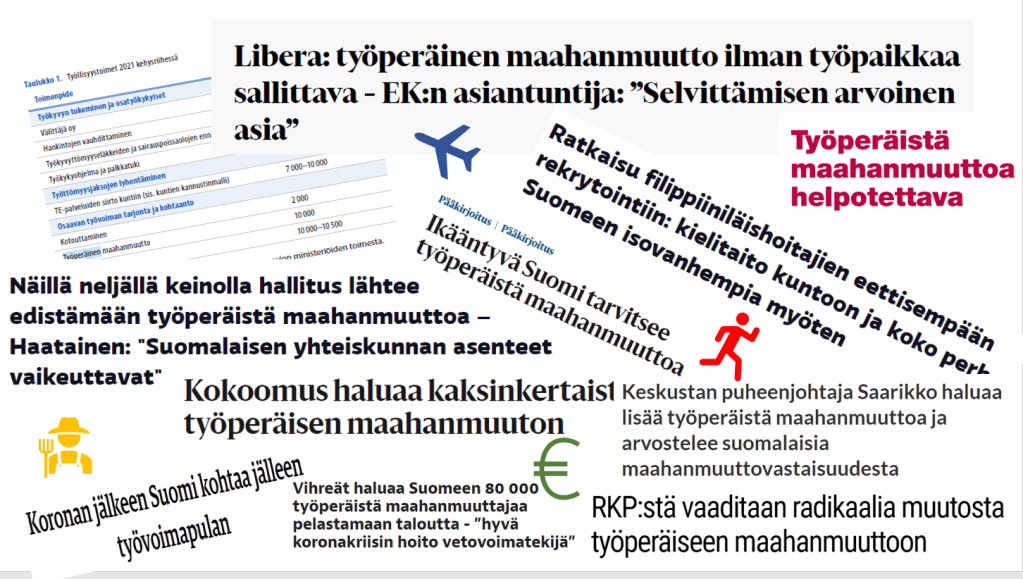 Työllisyyskeskustelu keskittyy kuitenkin yhä enemmän välttämättömään tarpeeseen saada kymmeniä tuhansia, satoja tuhansia, kovimmissa väitteissä vieläkin suurempia määriä ulkomaalaisia tekemään maamme töitä, joihin oma kansa – tai edes ne maassa jo olevat ulkomaalaiset – eivät syystä tai toisesta taivu.